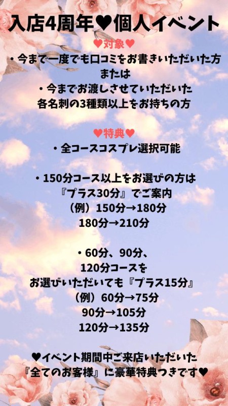 10/15(水)から11/14(金)までの間皆様へ感謝の気持ちを込めて…?入店4周年?個人イベントを開催させていただきます?内容は去年とほぼ…